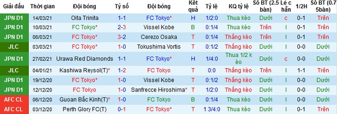 Trong mùa trước FC Tokyo đều giành chiến thắng trong cả 2 lần đối đầu. Thành tích sân nhà của FC Tokyo vẫn là khá tốt và trận thua mới đây trước Vissel Kobe có lẽ chỉ là một tai nạn nên chọn cửa trên ở trận đấu này vẫn có phần an toàn hơn.