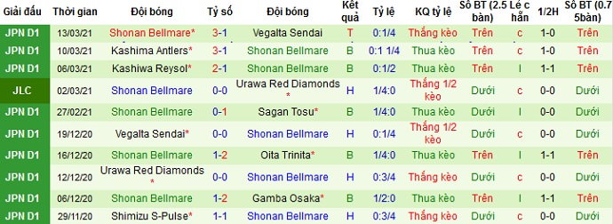 + Thống kê 10 trận gần nhất của Shonan Bellmare