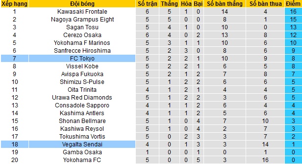 + Lịch sử đối đầu FC Tokyo vs Vegalta Sendai