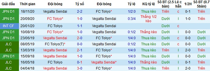 Trong 4 lần đối đầu gần đây khi FC Tokyo được thi đấu trên sân nhà họ thắng 2 và để hòa 2. Tuy nhiên phong độ gần đây của Vegalta Sendai đang sa sút nghiêm trọng ên chọn cửa trên ở trận đấu này là sự lựa chọn hoàn toàn hợp lý.