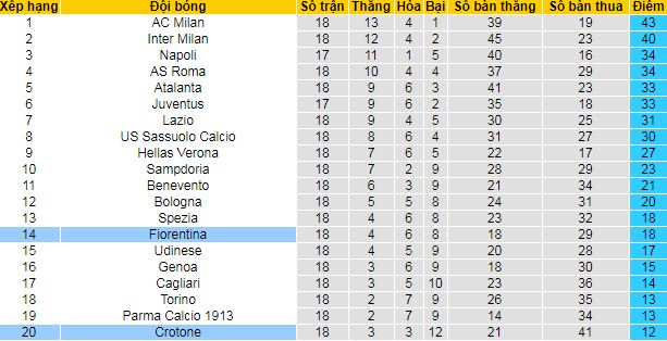 Đến vòng 18, chiến thắng trong sân nhà gần nhất tại Serie A trước Cagliari có thể coi là sự giải tỏa với đội chủ sân Artemio Franchi trong bối cảnh họ đang thi đấu thiếu ổn định ở mùa giải năm nay. 3 điểm sẽ là mục tiêu tối thượng của Fiorentina khi vòng đấu tiếp theo này đối thủ chỉ là đội bóng tân binh Crotone.