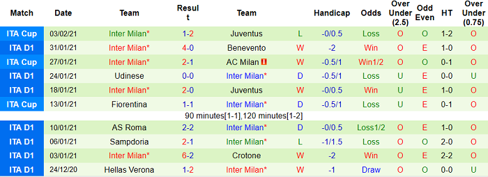 - Thống kê 10 trận gần nhất của Inter Milan