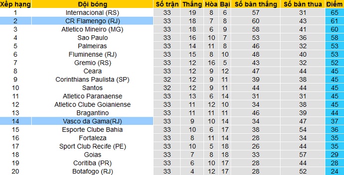 Bảng xếp hạng giải VĐQG Brazil trước vòng 34