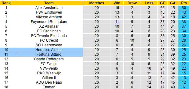 Đôi bên cùng giành được 25 điểm, Fortuna Sittard xếp dưới do kém về hiệu số. Khoảng cách mà 2 đội tạo ra với nhóm cầm đèn đỏ là rất an toàn, nhưng để vươn lên cạnh tranh với top dự Cúp châu Âu thì là điều không đơn giản, dù rằng cách biệt chỉ là 5 điểm.