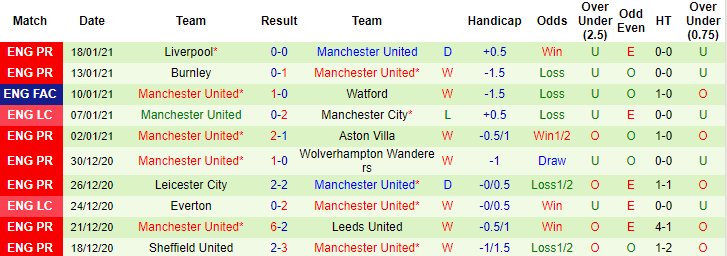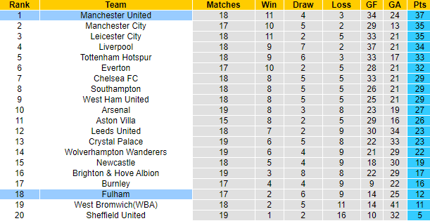 Fulham sau 17 trận tại giải Ngoại hạng Anh mùa này mới giành được 12 điểm, xếp ở vị trí thứ 18 trên bảng xếp hạng. Trong khi đó Man United đã giành được 37 điểm sau 18 trận, dẫn đầu cuộc đua vô địch Premier League 2020/21. Hai lần gần đây đối đầu Fulham, Man United đều thắng cách biệt 3 bàn.