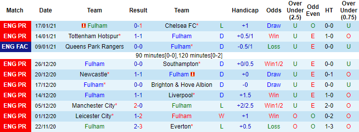 + Thống kê 10 trận gần nhất của Fulham