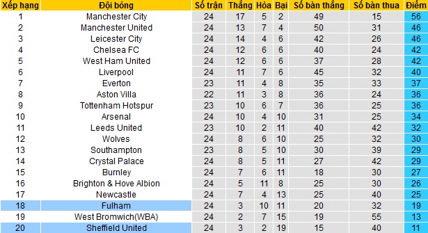 Tình cảnh của Sheffield United còn tồi tệ hơn khi hiện đang đứng bét bảng xếp hạng khi chỉ mới có được 11 điểm cũng sau 24 vòng đấu. Tuy chỉ kém đội áp chót West Brom 2 điểm nhưng khoảng cách của Sheffield United tới nhóm trụ hạng đã là 14 điểm và có lẽ chỉ có phép màu mới giúp đội bóng trụ hạng mùa này.
