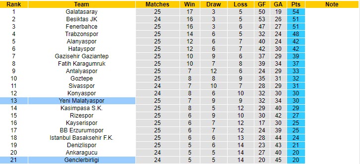 Genclerbirligi đang trong tình cảnh không mấy vui vẻ khi đứng ở vị trí cuối cùng trên BXH giải VĐQG Thổ Nhĩ Kỳ. Cụ thể, họ chỉ có được 20 điểm sau 24 lượt trận. Trên lý thuyết, cơ hội trụ hạng của Genclerbirligi là vẫn còn khi họ kém nhóm an toàn 5 điểm song đá ít hơn 1 trận.