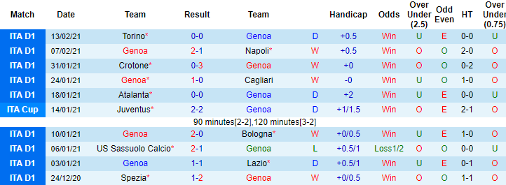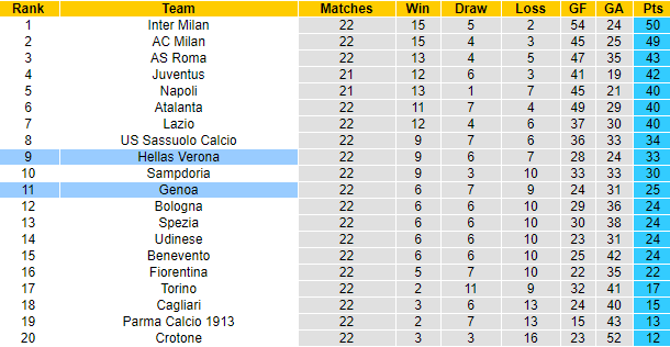 Thành tích của Genoa đang kém hơn so với Hellas Verona tại Serie A 2020/21. Theo đó, sau 22 vòng đấu Genoa giành 25 điểm, xếp thứ 11 trên bảng xếp hạng. Trong khi đó Hellas Verona đã giành được 33 điểm, xếp ở vị trí thứ 9.