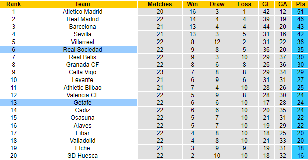 Getafe đang sa sút không phanh giai đoạn gần đây. 4 trận vừa qua tại La Liga họ thua 3, hoà 1 và toàn thua theo kèo châu Á. Trong khi đó sự trở lại của một loạt trụ cột sau chấn thương giúp Sociedad thi đấu khởi sắc rất rõ ở những lần xuất quân gần đây. Trận gần nhất Sociedad vùi dập Cadiz với tỷ số 4-1. 6 trận vừa qua Sociedad bất bại về mặt tỷ số và thắng 4 trận theo kèo châu Á.