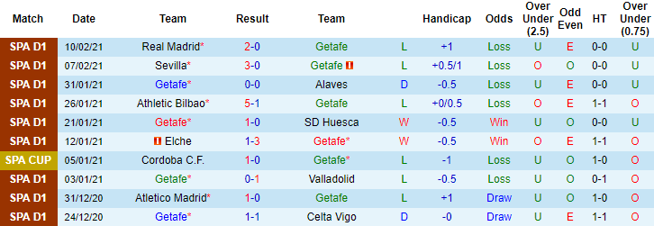 + Thống kê 10 trận gần nhất của Getafe