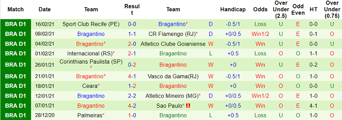 - Thống kê 10 trận gần nhất của Bragantino