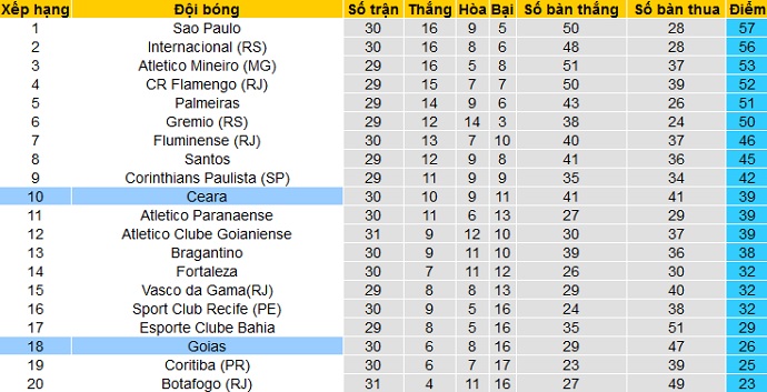 Bảng xếp hạng giải VĐQG Brazil vòng 31