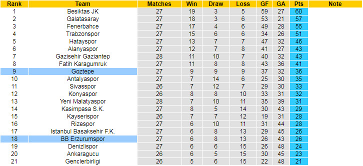 Nếu tính từ đầu mùa giải tới giờ, Goztepe Izmir thi đấu ổn định khi thắng 9, hòa 9 và để thua 9 lần sau 27 lượt trận. Hiện tại, họ đứng ở vị trí thứ 9 trên BXH.