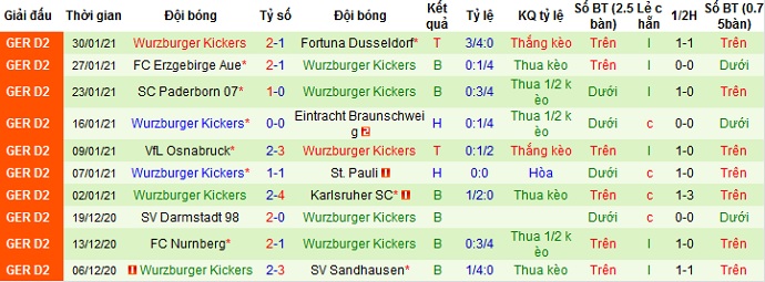 Tuy nhiên ở 5 trận đấu gần đây Würzburger Kickers cũng có được 2 trận thắng, 1 trận hòa và để thua 2 trận. Trên sân khách thành tích của Würzburger Kickers tệ hơn khá nhiều khi đội bóng chỉ thắng 1 trận duy nhất, để thua cả 4 trận còn lại trong 5 lần du đấu gần nhất.
