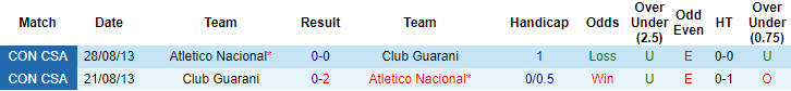 Guarani và Nacional từng gặp nhau 2 lần tại Copa Sudamericana 2013 (Cúp C2 Nam Mỹ). Ở chuyến làm khách đến sân của Guarani cách đây 8 năm, Nacional đã không mấy khó khăn để giành chiến thắng với tỷ số thuyết phục 2-0. Tuy nhiên điều đáng quan tâm là trước giờ bóng lăn trận đấu đó, Guarani đã sớm bị nghi ngờ khi xếp chiếu dưới theo mức kèo châu Á 1/4:0.