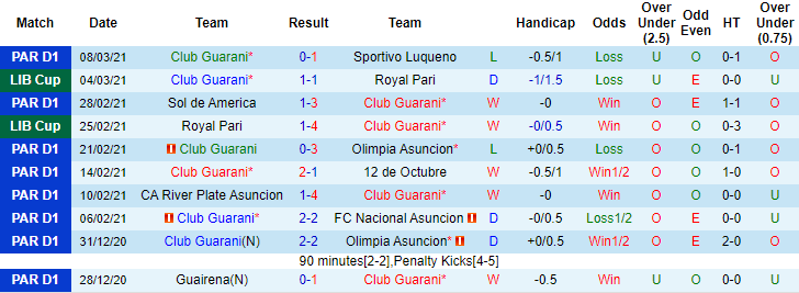 Lần tái đấu sắp tới chỉ số tương tự là 0:1/4, dấu hiệu sớm cho thấy niềm tin của giới chuyên môn vào khả năng giành chiến thắng của đội chủ nhà. Guarani cho thấy phong độ tốt khi đánh bại Royal Pari ở vòng loại đầu tiên Copa Libertadores mùa này với tổng tỷ số 5-2 sau hai lượt trận. Trong khi đó Nacional lại đang có dấu hiệu sa sút, họ không thắng 5 trên 6 trận sân khách gần đây (thua 3, hòa 2).