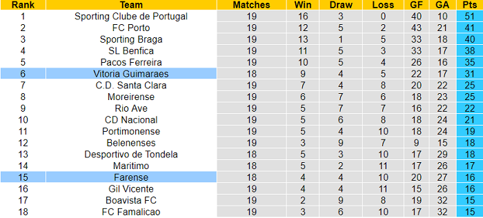 Thứ hai, Farense sở hữu thành tích không hề tốt tại Liga NOS 2020/21. Họ chỉ có được 16 điểm sau 18 trận đã đấu. Farense chỉ hơn nhóm ‘cầm đèn đỏ’ về chỉ số phụ.