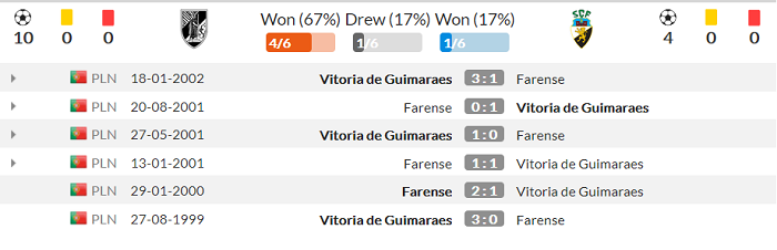 Thứ nhất, Farense là đối thủ mà Guimaraes có thể ‘bắt nạt’. Bằng chứng: Guimaraes thắng 4/6 lần so tài trước đây thuộc khuôn khổ giải VĐQG Bồ Đào Nha với Farense. 3 lần tiếp đón Farense trước đây, Guimaraes đều có được niềm vui trọn vẹn.
