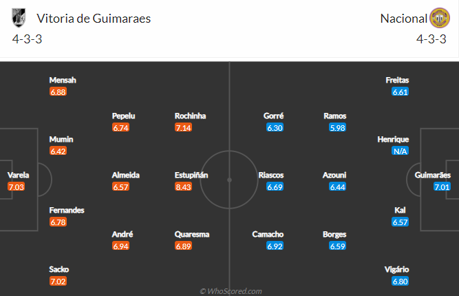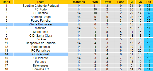 Sau 12 trận đấu tại giải VĐQG Bồ Đào Nha mùa này, Guimaraes đã giành được 20 điểm, xếp ở vị trí thứ 6 trên bảng xếp hạng. Trong khi đó Nacional mới giành được 13 điểm sau 14 trận, xếp sau đối thủ 8 bậc. Trận đấu sắp tới Guimaraes được chơi trên sân nhà nên họ càng xứng đáng được đánh giá cao hơn đối thủ trước giờ bóng lăn.