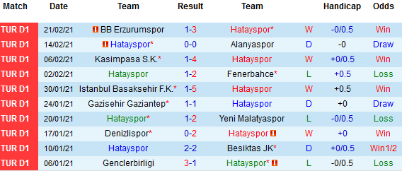 + Thống kê 10 trận gần nhất của Hatayspor