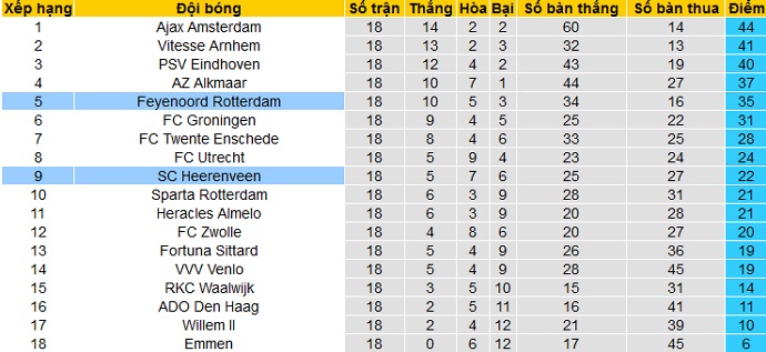 Trong khi đó Feyenoord đang nằm trong nhóm các đội có suất dự play-off tranh suất tham dự Europa League ở vị trí thứ 5. Với 35 điểm sau 18 vòng đấu, Feyenoord vẫn đang còn cách Top 3 tới 5 điểm và kém đội đầu bảng tới 9 điểm.