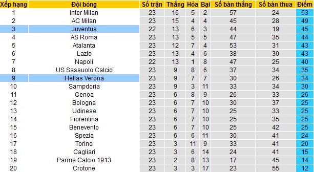 Sau 23 vòng đấu tại giải vô địch quốc gia Italia Serie A, Hellas Verona đang đứng ở vị trí thứ 9 của bảng xếp hạng. Với 34 điểm có được, Hellas Verona đang có nhiều hơn nhóm các đội cuối bảng tới gần 20 điểm. Thế nhưng khoảng cách với nhóm các đội có suất dự cúp châu Âu hiện vẫn đang lên tới 9 điểm.