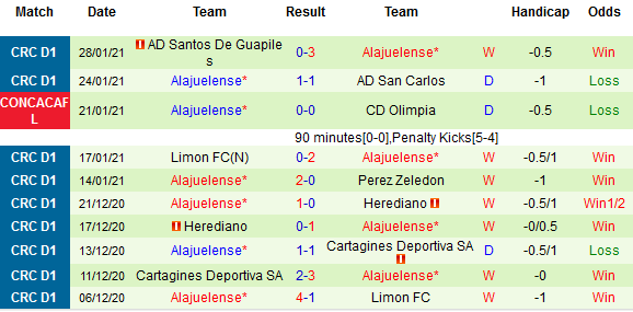 + Thống kê 10 trận gần nhất của Alajuelense