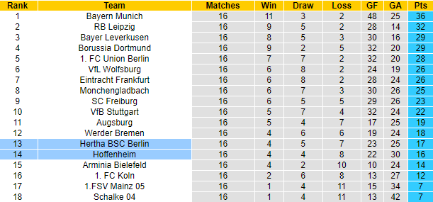 Phong độ và thống kê đối đầu Hertha Berlin vs Hoffenheim