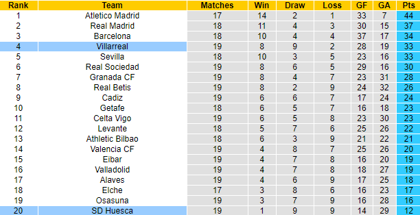 Huesca vẫn đang xếp ở dưới đáy bảng xếp hạng La Liga 2020/21 với vỏn vẹn 12 điểm sau 19 trận. Trong khi đó Villarreal đã giành được 33 điểm sau 19 trận, xếp ở vị trí thứ 4. Trên sân khách, Villarreal toàn thắng 3 trận gàn đây, xé lưới đối thủ 9 lần. Trong khi đó Huesca vừa trải qua chuỗi 5 trận thua liên tiếp tính trên mọi đấu trường.