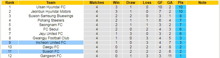 Chiều nay, Incheon có trận đấu tiếp đón tân binh Suwon và đây sẽ là cơ hội để đội bóng chủ sân Sungui Arena Park tìm kiếm một chiến thắng, qua đó cải thiện vị trí trên BXH. Nên nhớ, Suwon đang là một trong những đội bóng chưa từng nếm mùi thắng lợi ở mùa giải năm nay – hòa 2 và thua 2 sau 4 lượt trận.