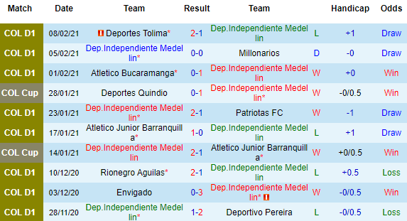 + Thống kê 10 trận gần nhất của Independiente Medellin