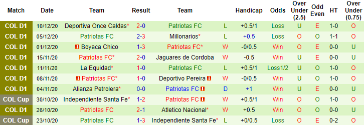 9 lần trước đây tiếp đón Patriotas trên sân nhà, Independiente Medellin toàn thắng cả về tỷ số và kèo châu Á, xé lưới đối thủ 24 lần. Ở các chuyến làm khách, Patriotas vẫn không tạo được sự tin tưởng với người hâm mộ. 19 trận xa nhà trước đó tại giải VĐQG Colombia, Patriotas thua 12, hòa 6 trận.