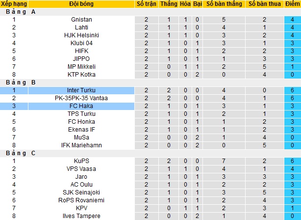 Tại bảng B của giải hạng nhất, sau 2 lượt trận đầu tiên Inter Turku đang dẫn đầu bảng với 6 điểm. FC Haka đang có được 3 điểm như FC Honka nhưng thua về hệ số đối đầu nên tạm thời xếp thứ ba.