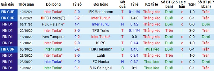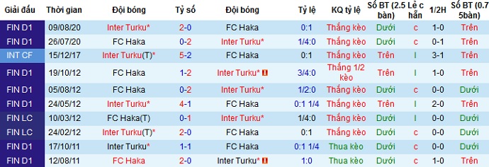 Tuy nhiên trong cả 10 lần đối đầu trước đó giữa hai đội FC Haka cũng chỉ có được 1 lần duy nhất cầm hòa được đối thủ và để thua ở cả 9 lần còn lại. Ngoài ra Inter Turku vẫn đang duy trì được phong độ ổn định nên chọn cửa trên ở trận đấu này là điều không cần bàn cãi.