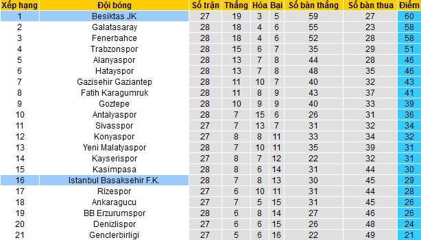 Trong khi đó Besiktas vẫn đang dẫn đầu bảng xếp hạng với 60 điểm sau 27 vòng đấu. Hiện Besiktas đang có nhiều hơn hai đội đứng ngay sau là Galatasaray và Fenerbahçe 2 điểm nhưng Besiktas đang thi đấu ít hơn 1 trận.