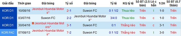 + Lịch sử đối đầu Jeonbuk Hyundai vs Suwon FC