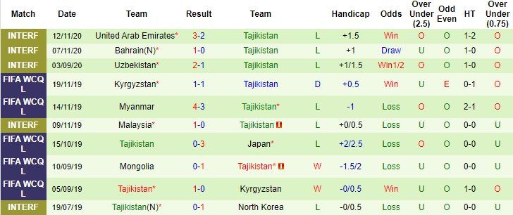 + Thống kê 10 trận gần nhất của Tajikistan