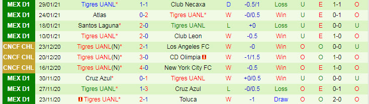 + Thống kê 10 trận gần nhất của Tigres UANL