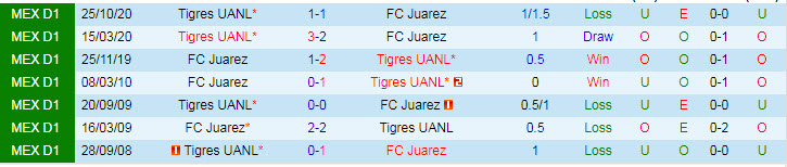 Phong độ và thống kê đối đầu Juarez - Tigres UANL gần đây: