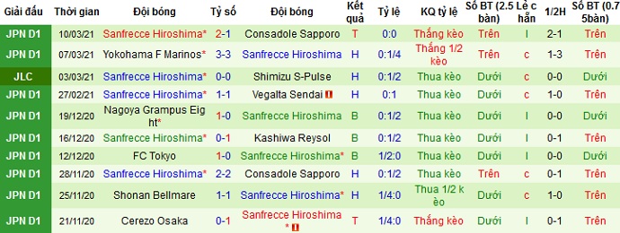 + Thống kê 10 trận gần nhất của Sanfrecce Hiroshima