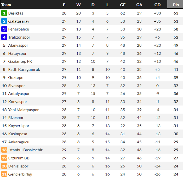 Bảng xếp hạng giải VĐQG Thổ Nhĩ Kỳ mới nhất