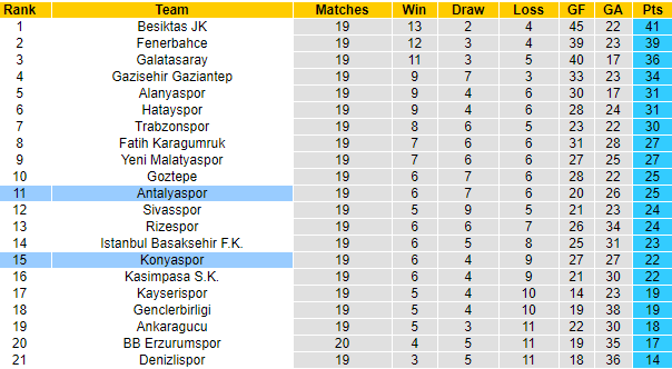 Cả 2 đội đều không được đánh giá cao ở mùa giải năm nay và mục tiêu khả dĩ với đôi bên cũng chỉ là trụ hạng. Tạm thời thì đến thời điểm hiện tại, khi mùa bóng đi qua được nửa chặng đường, cả Konyaspor và Antalyaspor đều đang có được vị trí cùng điểm số an toàn.