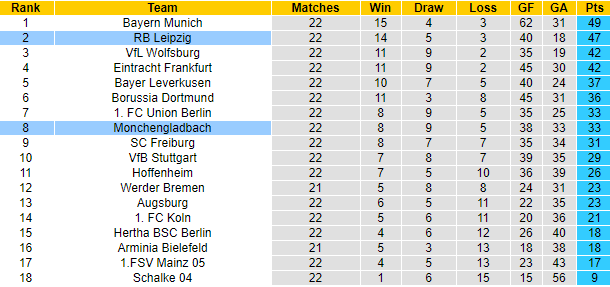 Leipzig vẫn đang xếp thứ 2 trên bảng xếp hạng Bundesliga. Sau 22 vòng đấu Leipzig đã giành được 47 điểm, chỉ kém đội đầu bảng Bayern Munich 2 điểm. Trong khi đó M'gladbach với số trận tương tự mới giành được 33 điểm, xếp ở vị trí thứ 8. Vậy nên cùng với việc được thi đấu trên sân nhà, Leipzig hoàn toàn xứng đáng được đánh giá cao hơn M'gladbach ở cuộc so tài sắp tới.