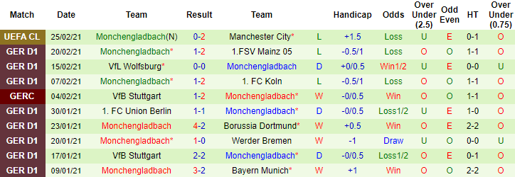 + Thống kê 10 trận gần nhất của M'gladbach