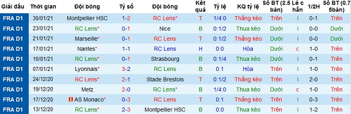 + Thống kê 10 trận gần nhất của Lens