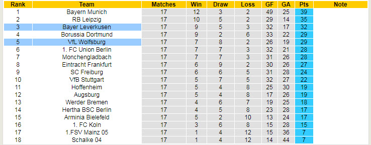 Với chiến thắng kể trên, tinh thần chiến đấu của Leverkusen đã được cải thiện đáng kể và giúp họ sẽ giành thêm một kết quả tốt trước Wolfsburg ở trận đêm nay tại vòng 18 giải VĐQG. Niềm tin chiến thắng của Leverkusen càng gia tăng khi được chơi sân nhà.