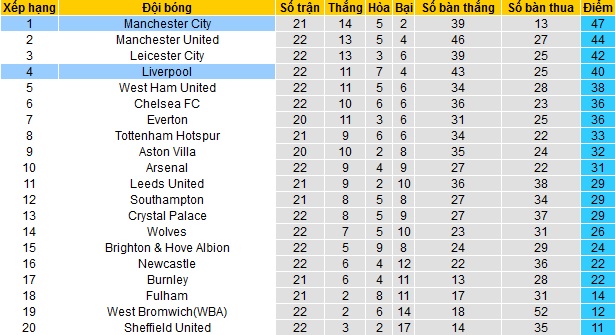 Trong khi đó Man City vẫn đang duy trì phong độ cực kỳ ổn đỉnh để vươn lên ngôi đầu của giải ngoại hạng. Hiện giờ với 47 điểm có được sau 21 vòng đấu, Man City đang có nhiều hơn đội nhì bảng Man United 3 điểm và nhiều hơn chính Liverpool tới 7 điểm.