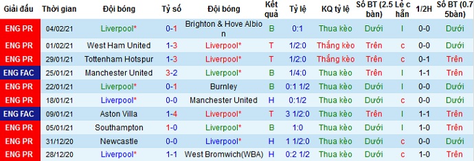 + Thống kê 10 trận gần nhất của Liverpool