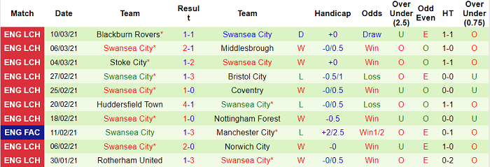 - Thống kê 10 trận gần nhất của Swansea